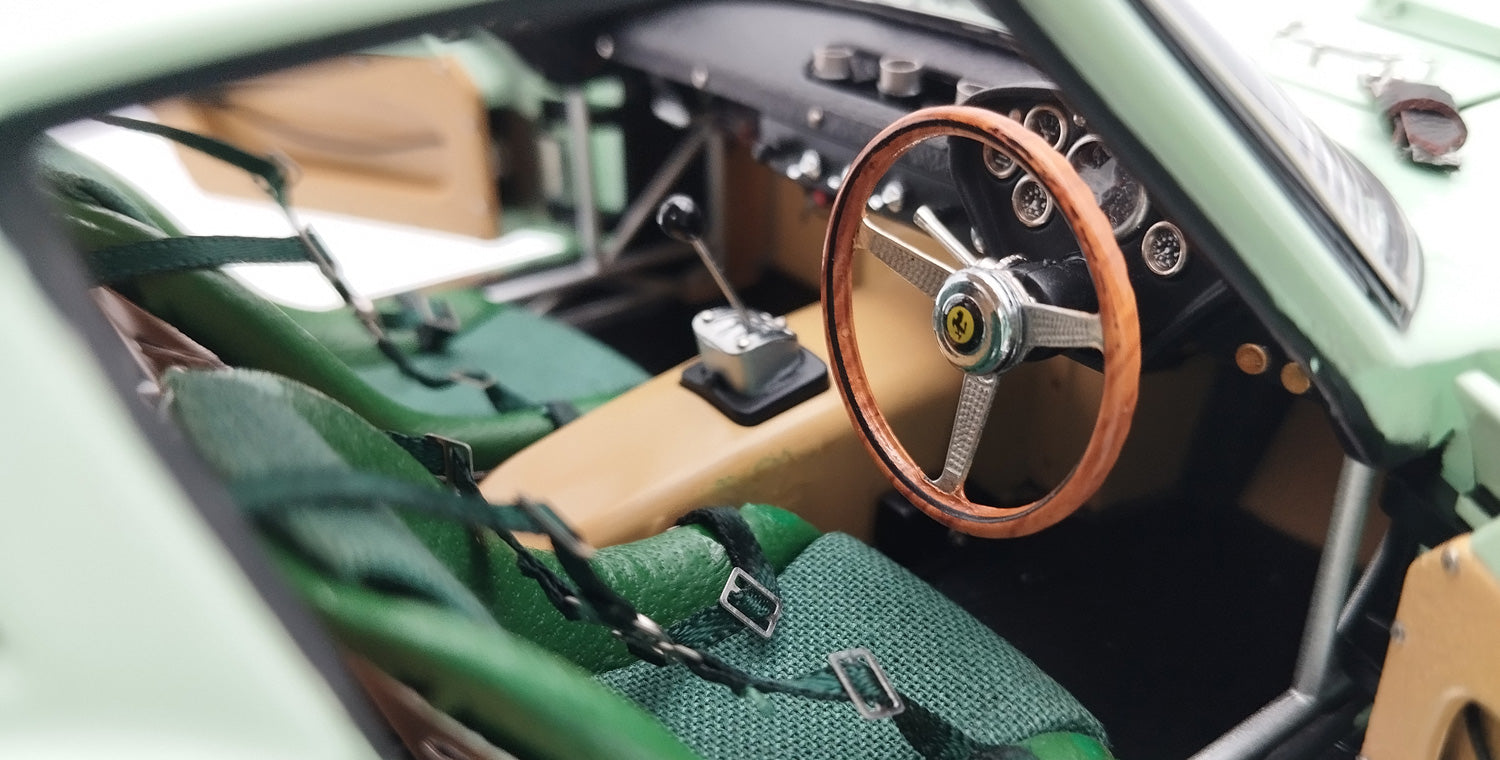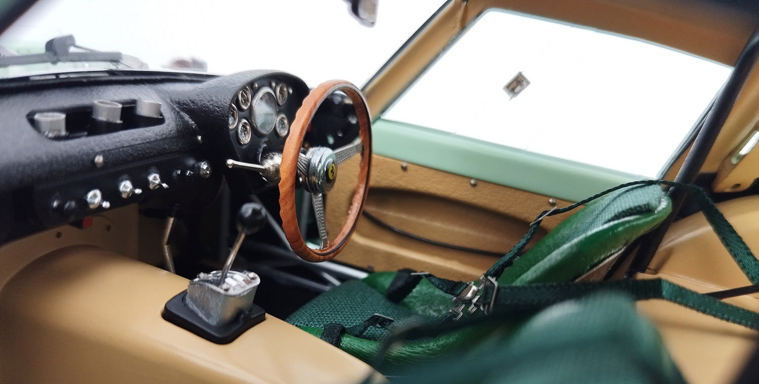 Finished in the striking Laystall colours (pale green), this was the first right-hand driver 250 GTO. Originally ordered for Stirling Moss to race for the UDT-Laystall team, but after his career-ending crash at Goodwood, it was raced by Innes Ireland instead on August 18, 1962 with start number #15 to an outright victory in the Tourist Trophy at Goodwood. That is the car that M-247 presents. In retrospect, Ireland mesmerized: “We picked up the car at Maranello, drove it directly to Goodwood and immediately after a plug- and a tire-change we started a one-hour testing on the track.“ Chassis 3506 was raced successfully by various famous drivers, including Willy Mairesse (Le Mans Trial), Masten Gregory (Silverstone), Innes Ireland (Le Mans, Brands Hatch, Goodwood), and Gunther Philipp, an Austrian owner and racecar driver, who had chassis 3505GT repainted red and campaigned the car triumphantly in Vienne GP, Austria GP, and Preis von Wien, GT race. In 2012, the car was acquired by the current custodian for a reputed 35 million dollars, which at the time was the highest bid ever known to have been paid for a car.